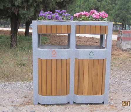 6.鋼木垃圾桶 鋼木垃圾桶所用的木頭為菲律賓進口山樟木,此木頭顏色天然淺紅色,木質硬,不變形,不開裂,經過嚴格的防腐處理后三遍打磨,上色(浸泡技術),然后外面刷戶外亮漆,能達到家具標準。